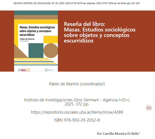 de Marinis, Pablo (coord). Masas. Estudios sociológicos sobre objetos y conceptos escurridizos Reseña realizada por Camilla Moreira Di Bello del último libro colectivo del GEPyC/TS, publicada en Revista Central de Sociología. La reseña se encuentra disponible aquí.